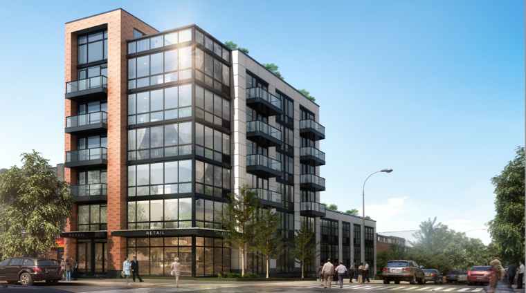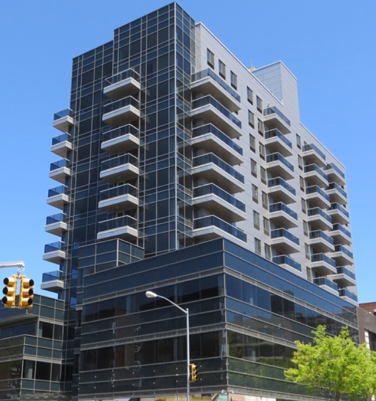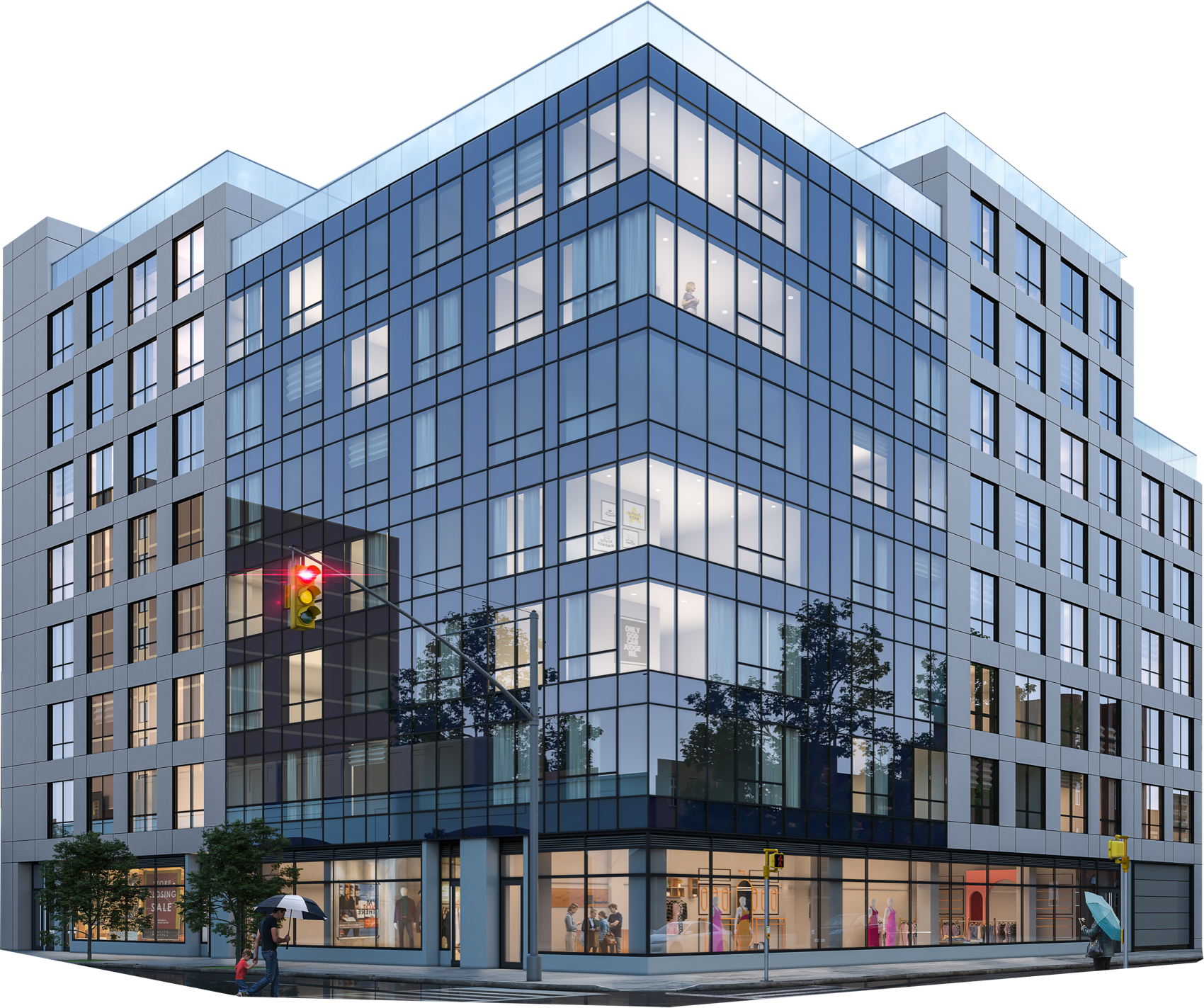 8层现代建筑, 5家零售店、 63套公寓、 24个地下停车位;